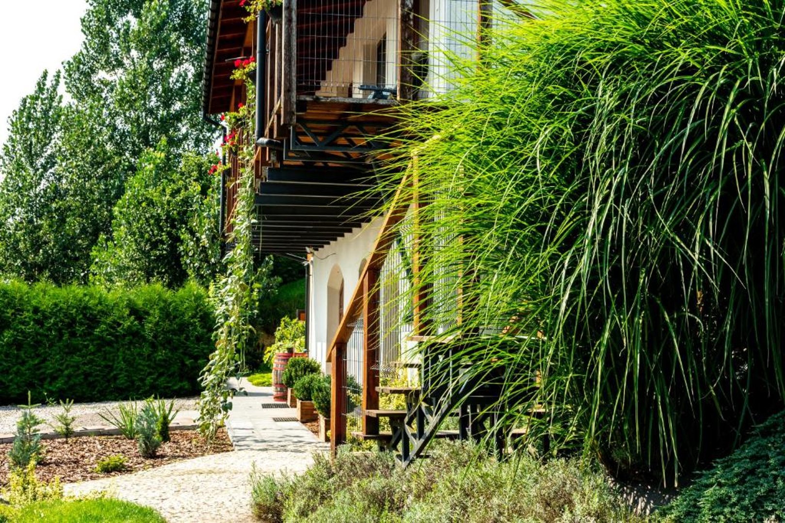 Wszystkie opcje zakwaterowania mają balkon, skąd roztacza się widok na ogród. W każdej opcji znajduje się też kuchnia z piekarnikiem i zmywarką oraz prywatna łazienka z prysznicem.